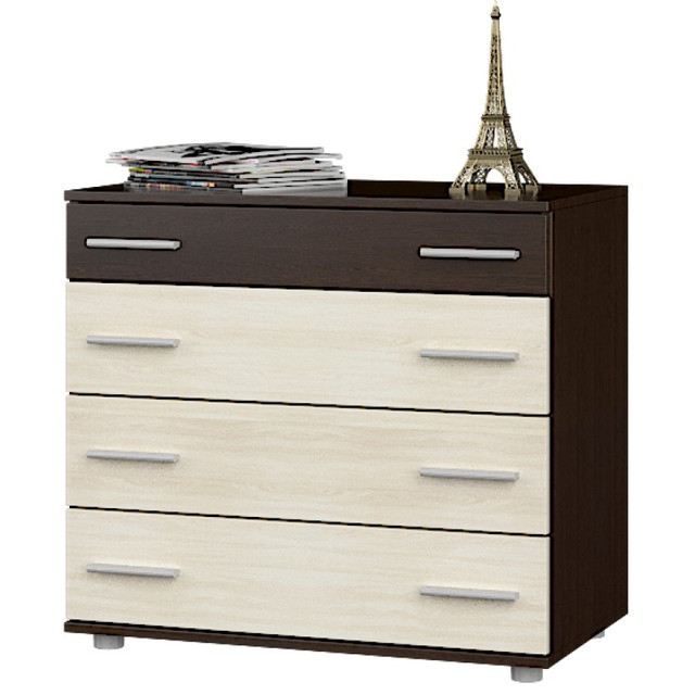 Має 4 місткі висувні ящики. Матеріал виготовлення корпусу і фасадів комода - ламіноване ДСП, товщиною 16 мм, крайка ПВХ 0,5 мм Комод відмінно підійде для маленкой кімнати і вмістить всі Ваші речі і одяг.