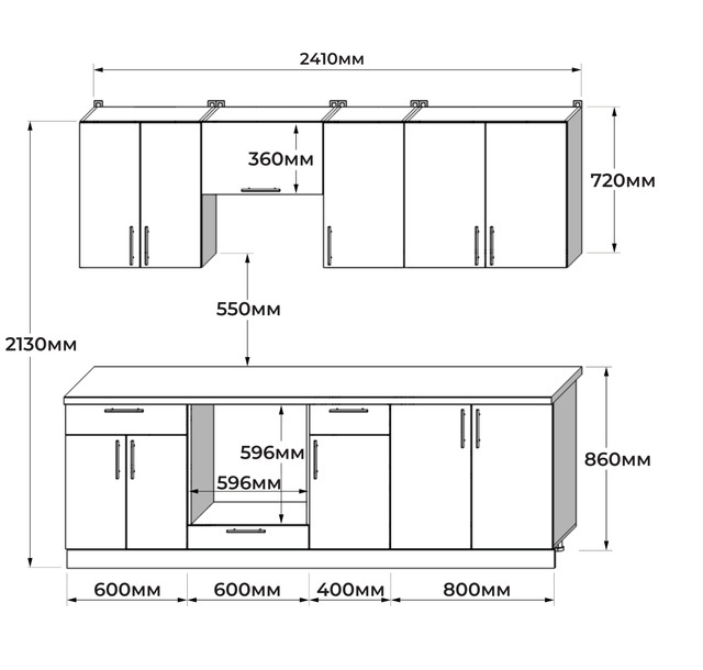 Комплект складається з верхніх і нижніх секцій Ви можете розставити їх у будь-якому порядку та замовити суцільну стільницю. Якщо Вам необхідно додати секції до кухні, можете придбати їх окремо.
